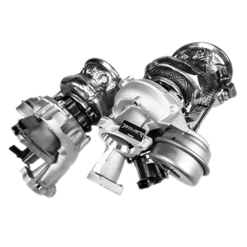 Introducing the PD1200 Ball-Bearing Turbochargers – Unparalleled, Tailor-Made Turbochargers for the most demanding EA825 platform builds globally. Turbochargers play a pivotal role in power production. The efficiency of OEM turbochargers diminishes rapidly, making it a crucial aspect to address for achieving high-power outputs. Our objective was to develop a solution that overcomes the limitations of other custom turbos on the market – a reliable turbocharger suitable for daily driving with excellent throttle response while also performing efficiently at high boost, effortlessly delivering over 1200hp. Power Division's PD1200 turbochargers are meticulously designed, featuring a larger billet compressor impeller, a completely redesigned turbine wheel, precisely machined housing, and reinforced ball bearings. These turbochargers are entirely new and offer a Plug&Play fitment.