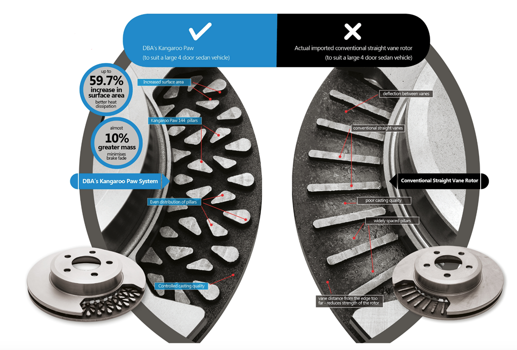 Kangaroo Paw 144 diamond and tear drop pillar ventilation system Increased surface area results in greater heat dissipation Minimises brake fade and increases braking effectiveness
